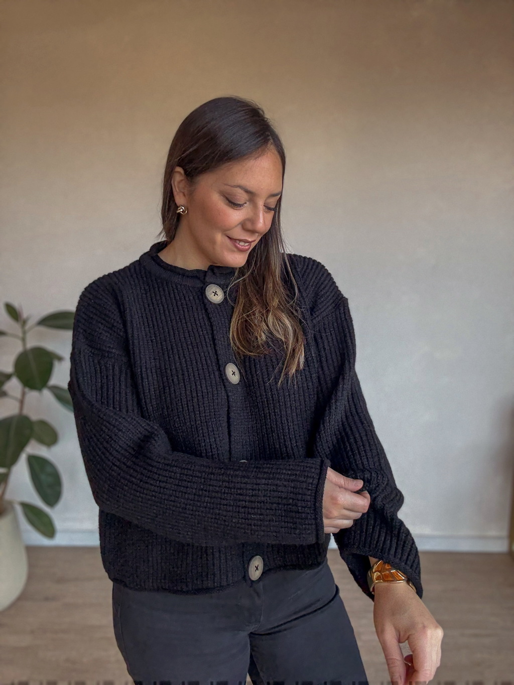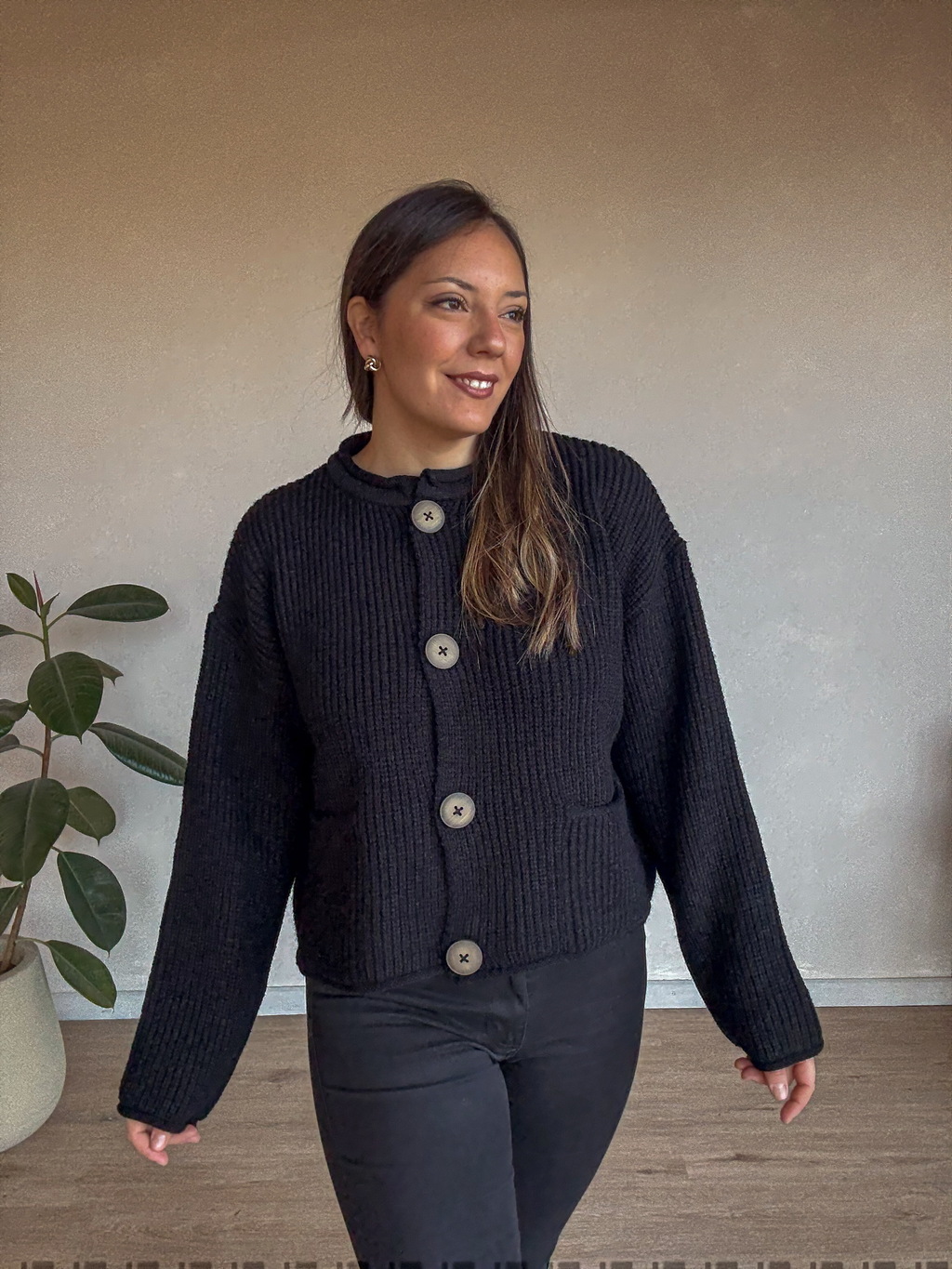 Un básico con mucha personalidad. Este cardigan tejido en punto inglés tiene un diseño recto, botones grandes que le dan presencia y bolsillos delanteros súper prácticos. El largo a la cintura lo hace ideal para looks urbanos y modernos.