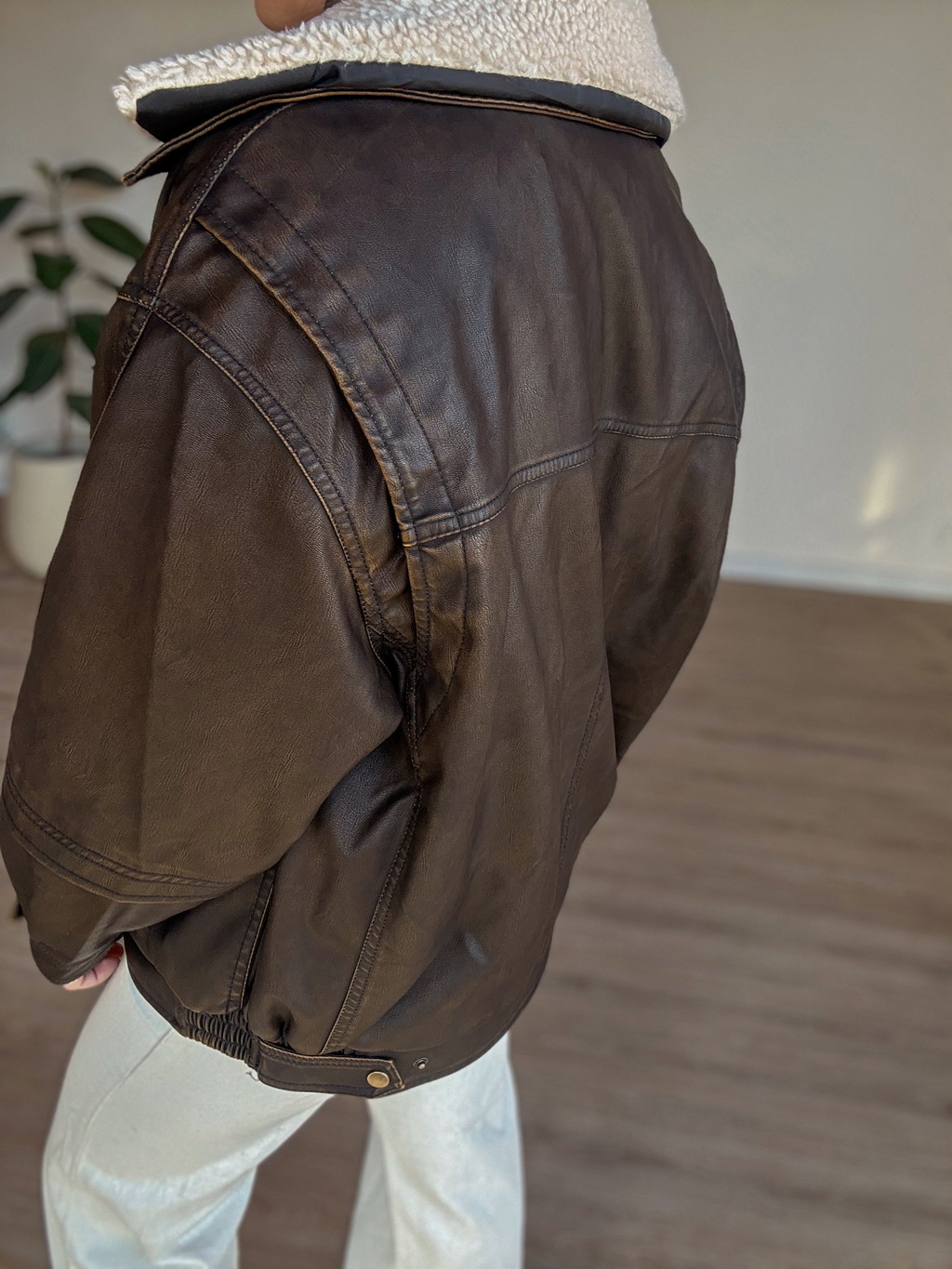 Sumale onda y actitud a tus outfits con esta chaqueta bomber de corte oversized de eco cuero en marron gastado. Su diseño está inspirado en el estilo aviador vintage. con costuras a la vista, bolsillos grandes con broche y cierre metalico. Ideal para los dias frescos, combina lo canchero con lo comodo.-