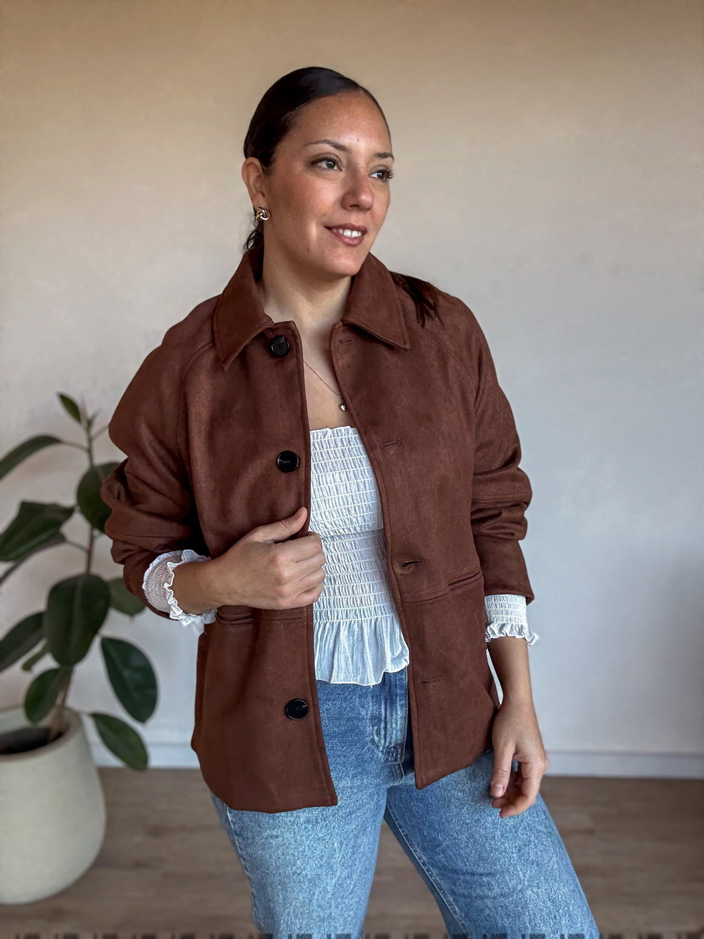 Clásica, versátil y atemporal: esta chaqueta en gamuza es el abrigo ideal para elevar cualquier look de temporada. Confeccionada en un tejido suave y cálido, su diseño oversize con hombros caídos aporta un aire relajado sin perder elegancia. Cuenta con botones delanteros grandes y bolsillos funcionales que combinan estilo con practicidad.
