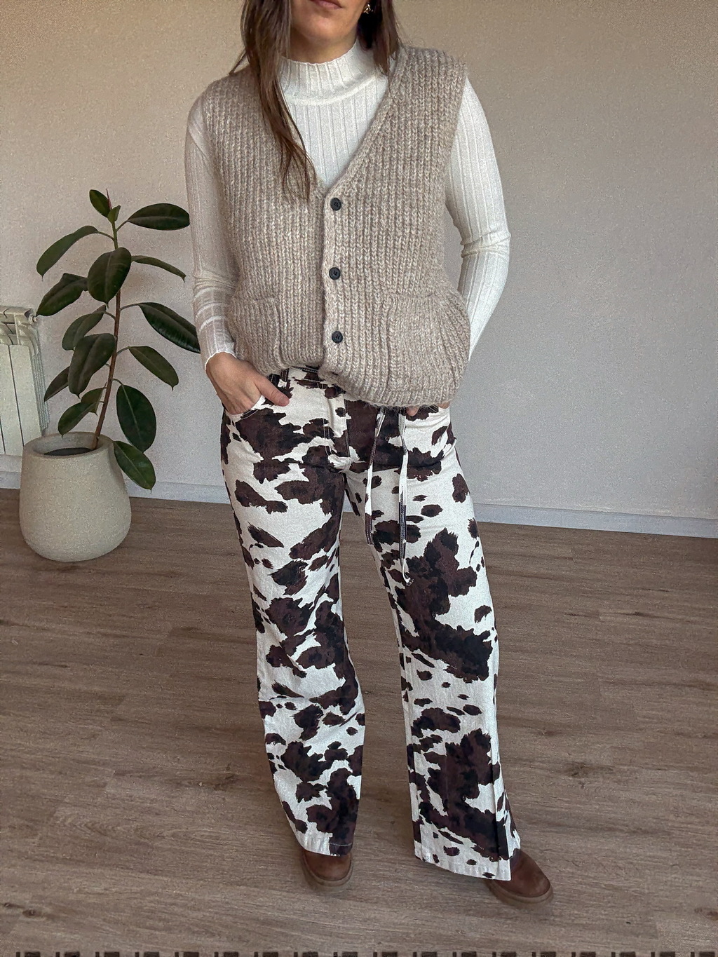 Animate a destacar con nuestro Denim Wide leg Cowprint, una prenda unica que combina estilo y comodidad sin esfuerzo. Con un corte holgado y fluido, este pantalon ofrece una silueta favorecedora y versátil que se adapta a cualquier ocasion! Su estampado en natural, chocolate y negro aporta ese toque trendy y urbano que transforma cualquier look!
