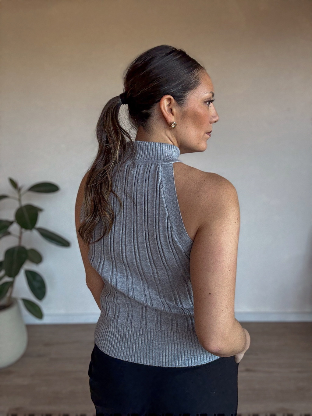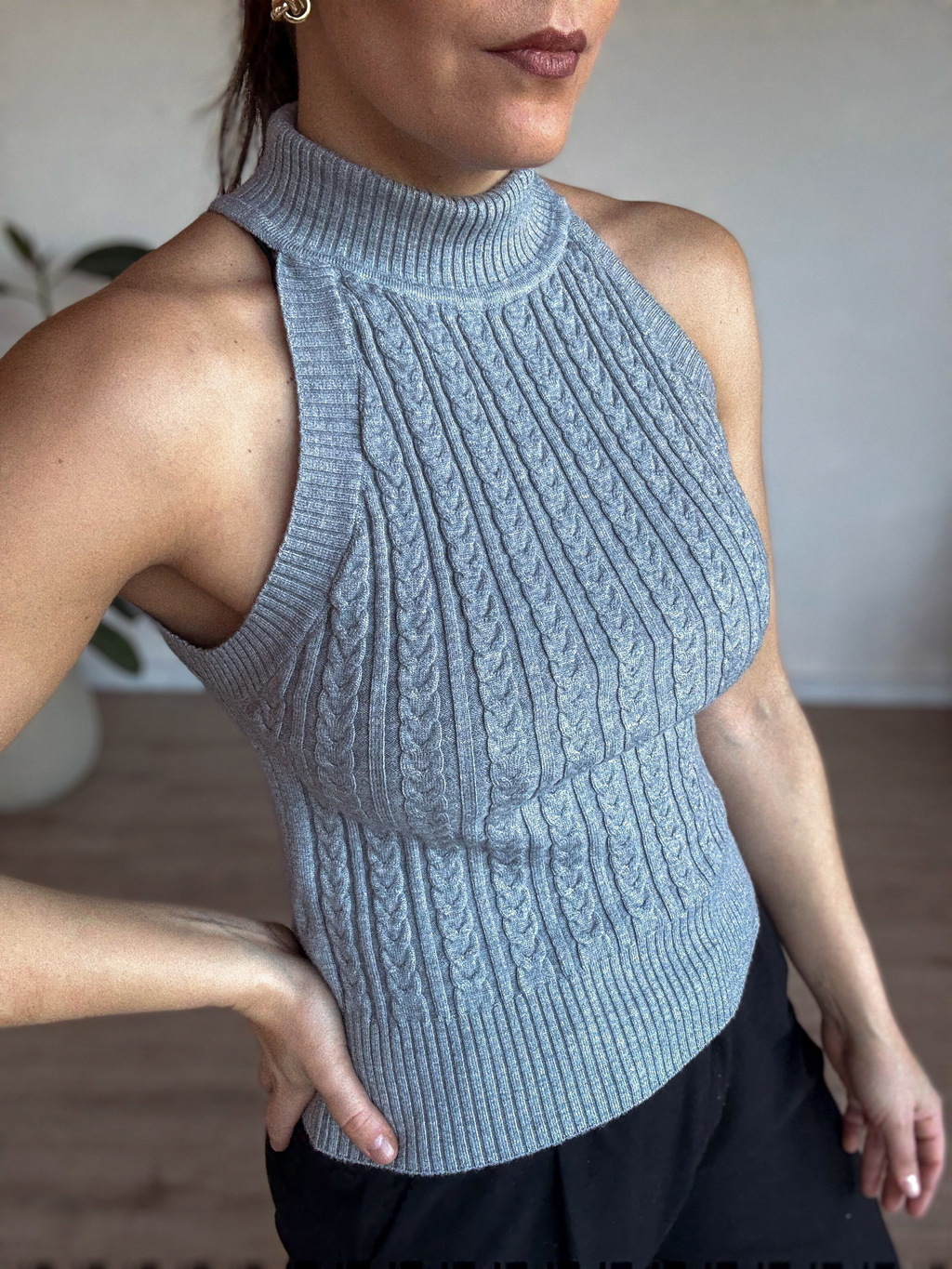 Una prenda versátil y sofisticada que eleva cualquier look. Esta musculosa tejida en un tono neutro y elegante combina la calidez del tejido con un diseño sin mangas que resalta los hombros y alarga la figura. Su textura de trenzas aporta un toque clásico, mientras que el cuello alto acanalado le suma modernidad y estilo.