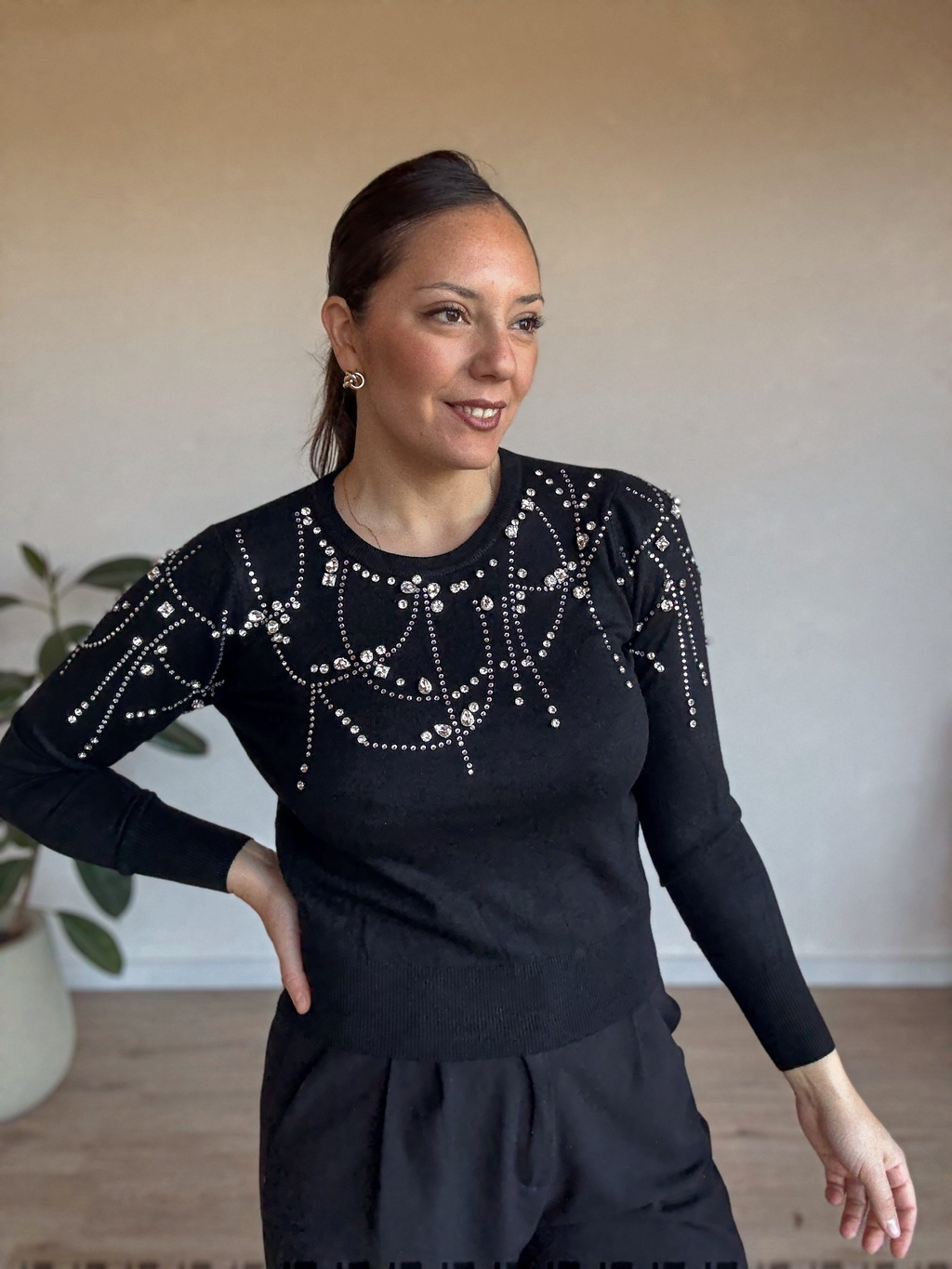 Luci sofisticada y con mucho estilo con este sweater negro adornado con pedrería brillante. El diseño de cristales crea un efecto elegante y llamativo, ideal para eventos especiales o para elevar cualquier outfit. Su corte entallado en la cintura realza la silueta, mientras que el tejido suave proporciona comodidad durante todo el día.