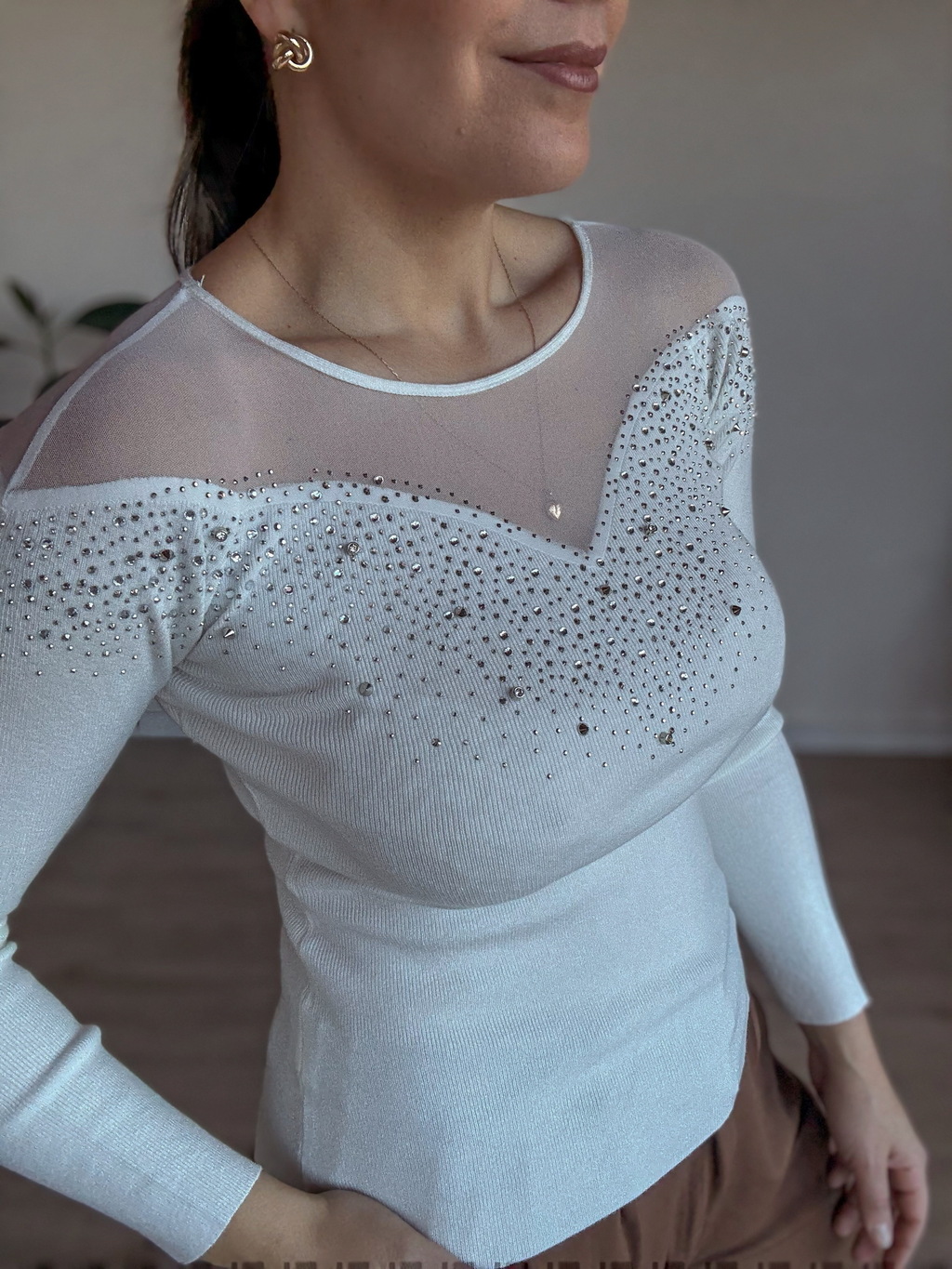 Este sweater de manga larga combina sofisticación y estilo gracias a su escote ilusión en tul transparente y el delicado bordado de brillos que aporta un efecto de estrellas. Ajustado al cuerpo, suave al tacto y con un diseño que realza la silueta, es perfecto para tus salidas nocturnas o para cuando simplemente quieras verte increíble